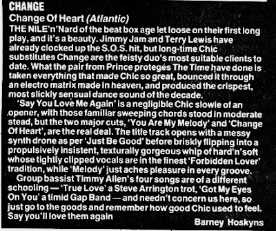 Change's Chic-like "Change of Heart" (written, arranged and produced by Jam & Lewis) has the melodic spacing in the chorus in full effect. But the verses are also quite rectilinear (not sure if that's the right word but I'm sticking with it). It's a very controlled sounding record.